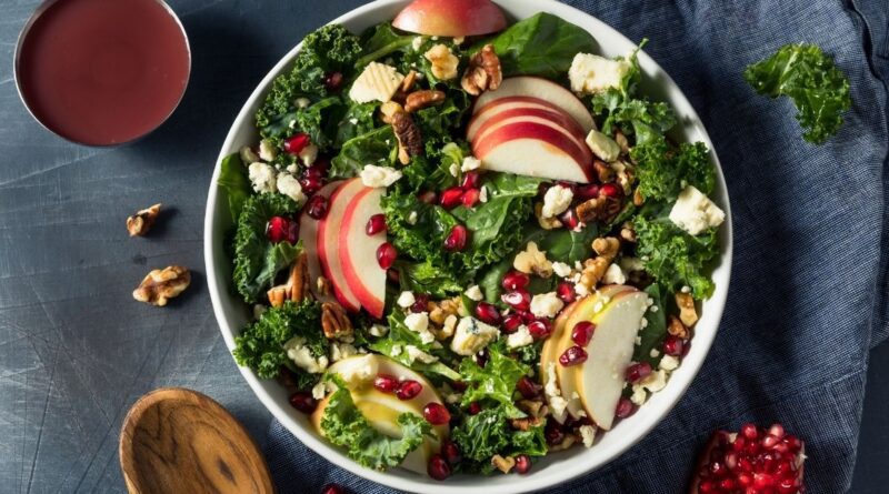 Beginnen wir mit einem sehr einfachen Salatrezept. Dieses hat Apfel und Cheddar als Hauptzutaten, und sie alle gehen auf ein Bett aus Grünkohl. Die Süße des Apfels hilft, die Bitterkeit des Grünkohls auszugleichen. Gleichzeitig trägt der Cheddar dazu bei, die Säure des Apfels neutraler zu machen, um Mundgesundheitsproblemen vorzubeugen.